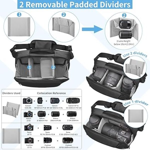 - 【Perfect Size& Removable Dividers】Dimensions:12.6″L*5.1″W*7.8″H; Fits DSLR/SLR/Mirrorless Camera or others.The main compartment for 1 DSLR plus 2-3 exchange lenses, battery and other camera accessories.2 removable padded dividers enable you to customize to fit your camera equipment.