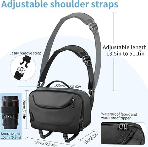 - 【Versatilit】Padded shoulder strap varied from 13.5 to maximum 51.1 inch can be adjusted personal preference.It can be a crossbody camera bag for women and men, and can be used as a everyday shoulder bag(removing inner dividers)or fanny pack.An ideal gifts for friends,family